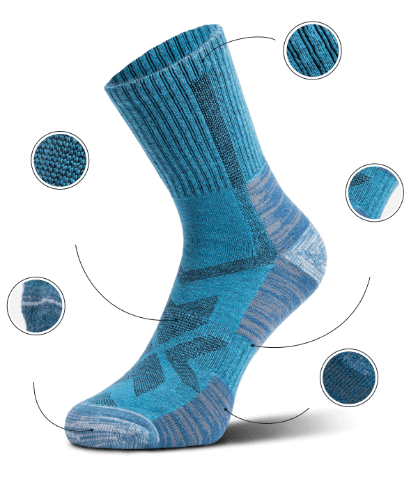 Our hiking socks are made from a balanced mix of premium Merino wool and performance fibers. The result? All-day comfort with less moisture, fewer blisters, no bulk, and no itch.